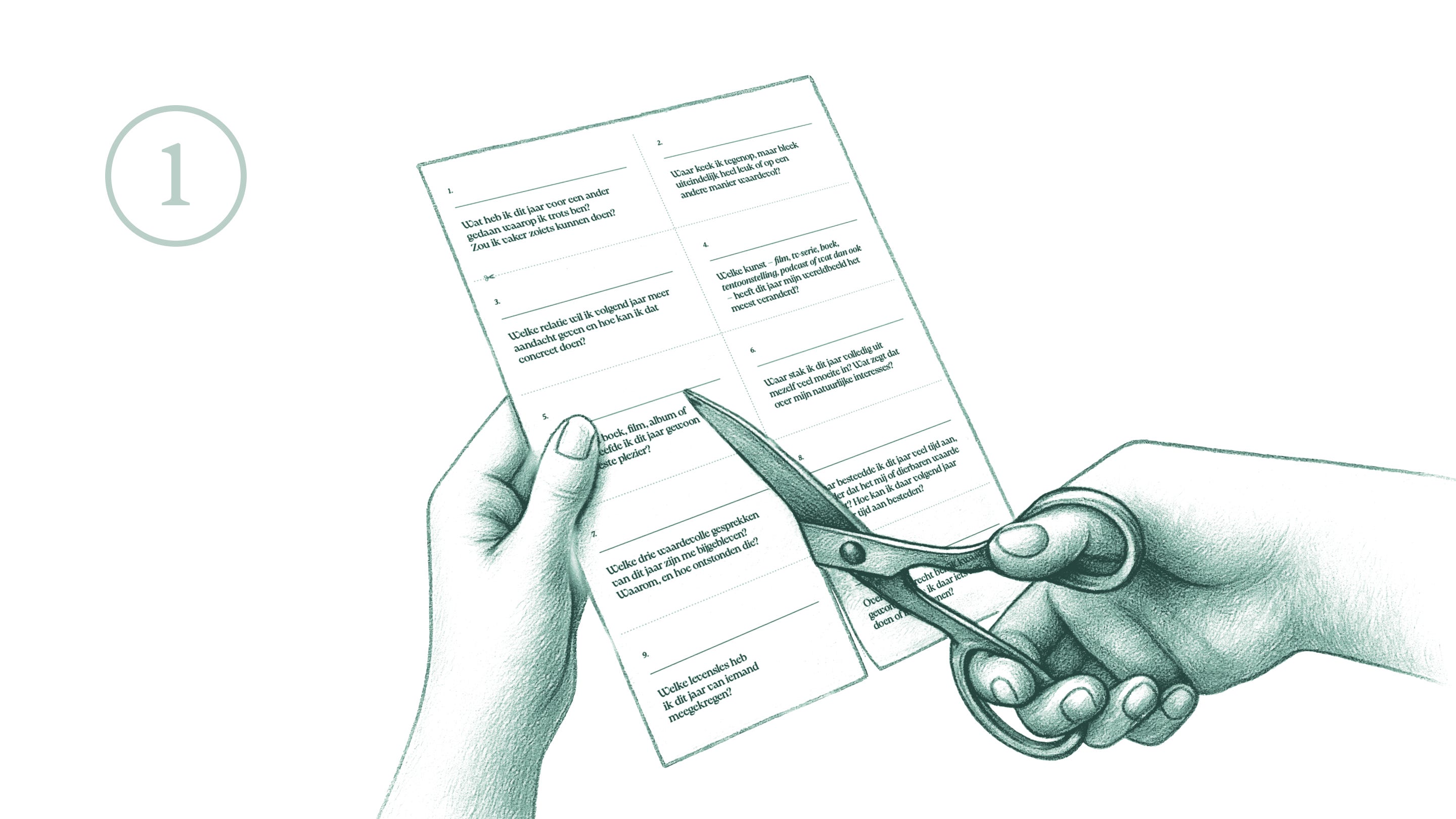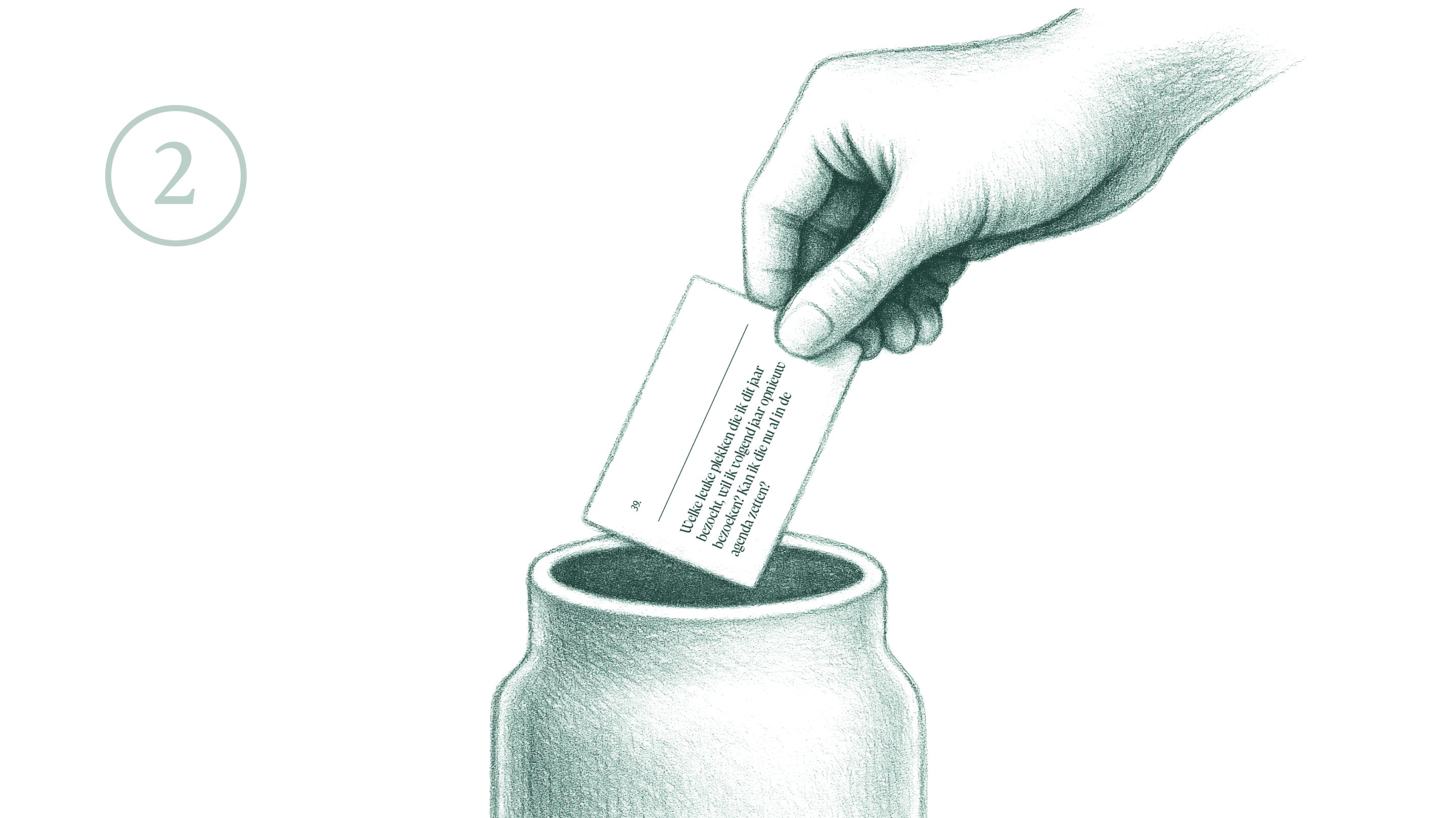 Denk je liever samen met anderen na over het komende jaar? Je kunt de veertig reflectievragen ook uitknippen en in een vaas stoppen. Dat doe ik op oudejaarsavond met vrienden, gecombineerd met een rondje hoogte- en dieptepunten. Dat levert altijd waardevolle gesprekken op, voor het feestgedruis definitief losbarst.