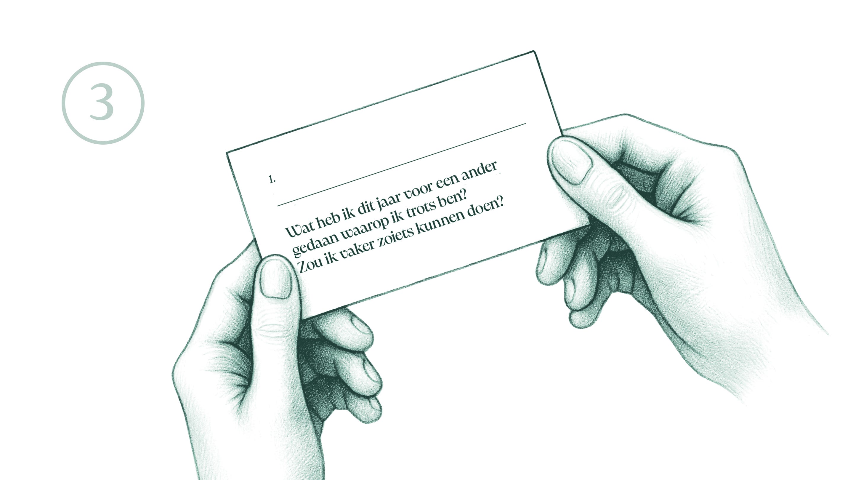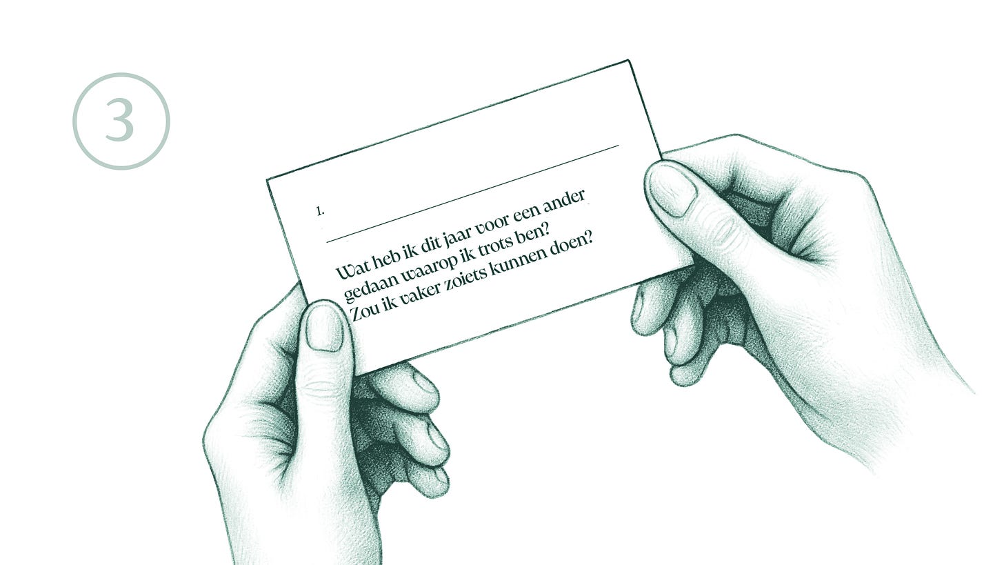 Oh, en even voor de zekerheid: de vragen zijn suggesties. Je kunt er ook drie uitpikken en die beantwoorden. Elk moment van reflectie is al waardevol, dus maak de drempel niet te hoog voor jezelf.